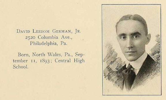 David Leedom German, Jr., b. Sept 11 1893; LL.B., 1917; Attorney; attached O.T.C. and sergt., Org. Dept., U.S.A.1218 chestnut St. and 2520 W. Columbia Ave., Phila., PA